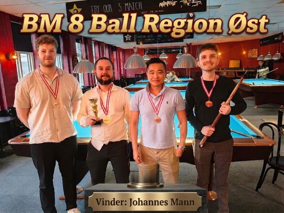 Blandt de mange gode præstationer i løbet af dag, imponerede især Emil Kannegaard Høck, som kun afgav 2 sæt på 3 kampe på vej til kvartfinalen. Til sidst var det dog Johannes Mann, der løb med guldet og titlen som Regionsmester i 8 Ball Øst, med en 5-3 sejr over Hai Sieu Phung i finalen.